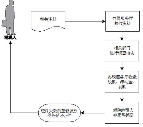 事项名称: 非正常户解除 设定依据: 《税务登记管理办法》(国家税务总局令第36号); 《国家税务总局关于进一步完善税务登记管理有关问题的公告》(国家税务总局公告2011年第21号)。 申请条件: 被税务机关认定为非正常户的纳税人,依法履行纳税义务后,税务机关解除其非正常户状态。 办理材料: 纳税人提供情况说明和解除非正常状态的理由。 办理地点: 各地办税服务厅。 办理时间: 各地办税服务厅工作时间。 联系电话: 12366 办理流程: